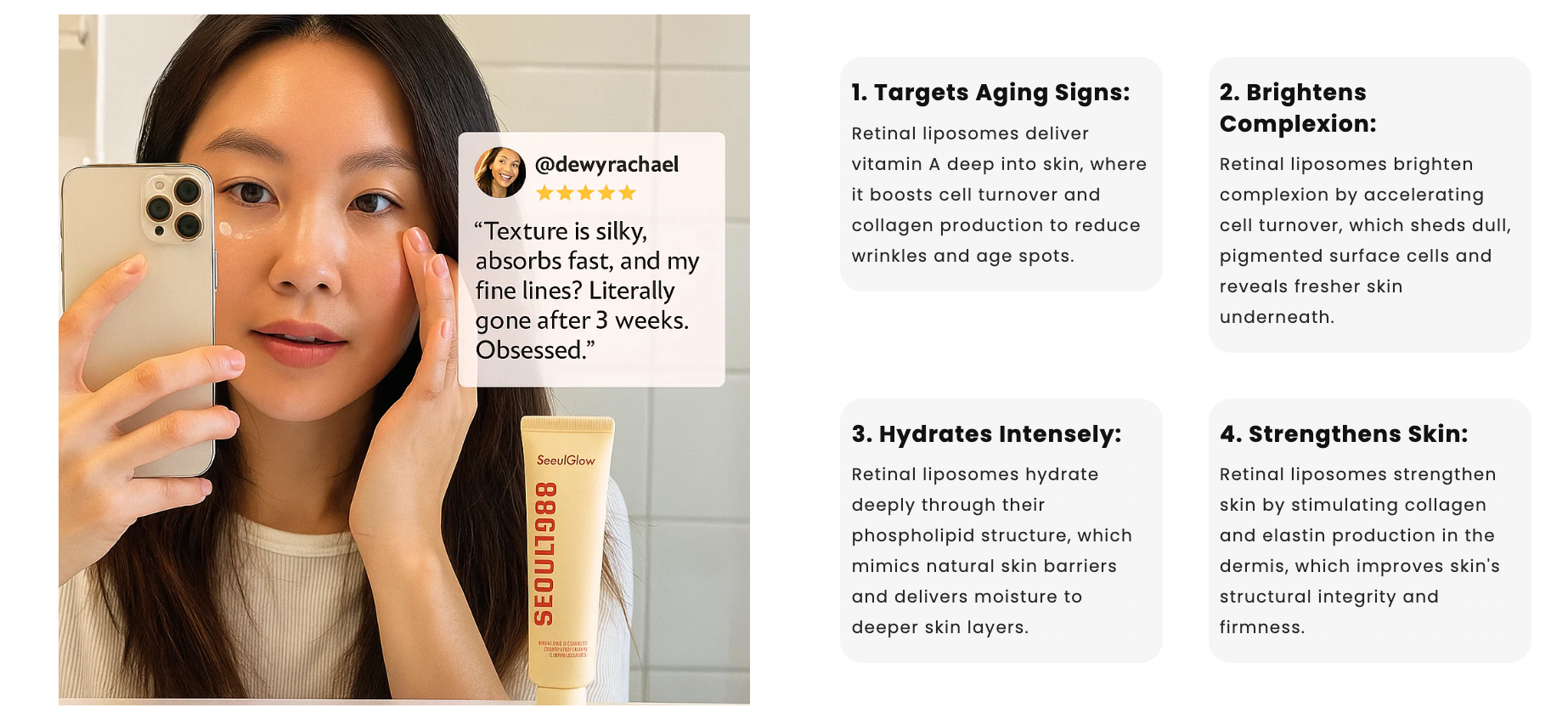 This product contains retinal encapsulated in liposomes, which improves stability and penetration. “4% retinal liposome” typically equals about 0.04% pure retinal—a gentle but effective dose for beginners